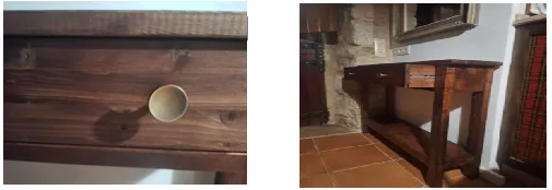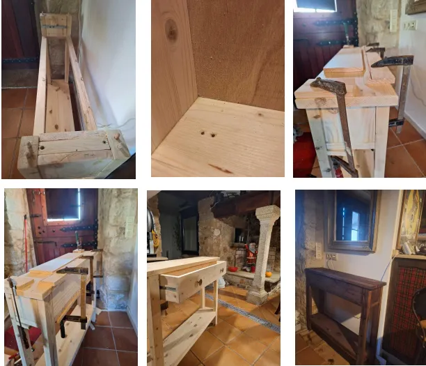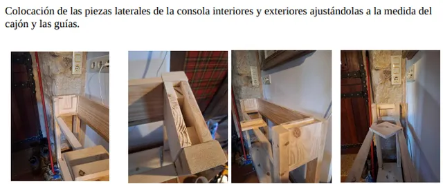Ensamblaje de las tapa superior y del estante inferior utilizando espigas de madera y cola para madera. Presentación del cajón dentro de sus guías y preparación de las perforaciones y avellanado dentro del cajón. Presentación de los tiradores y perforación para su roscado. En la última foto de la siguiente serie se puede ver el tintado de las distintas partes de la consola.