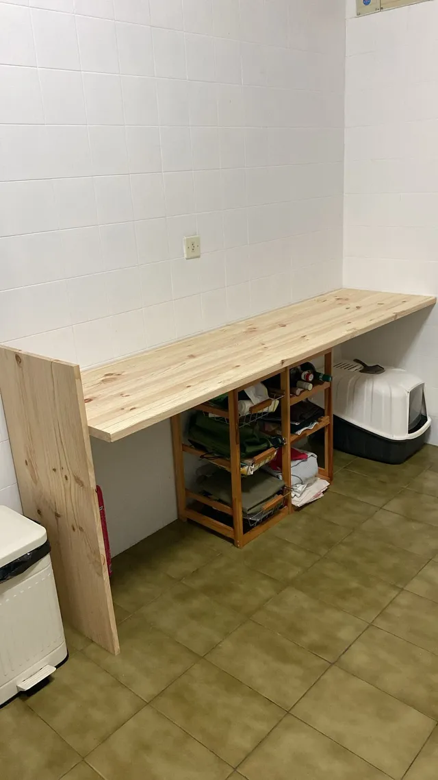Utilicé un tablero de pino de 240 x 50 x 2,8 cm para el sobre de la barra Un tablero de pino de 240 x 50 x 1,8 cm para la zona de baldas