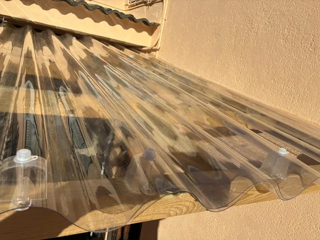 Ya únicamente faltaba fijar el tejado, que elegí en plancha de ondas grandes transparente y se fija con un kit que te viene ya la pieza, el tornillo y el capuchón para la lluvia.