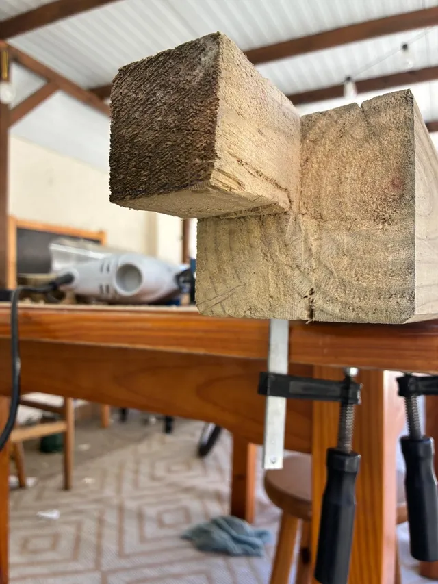 En este punto, era el momento de plantear el pilar, que no quise agujerear al suelo y decidí poner unas pletinas fijadas al muro. Para la unión del pilar y la estructura principal, hice un encaje