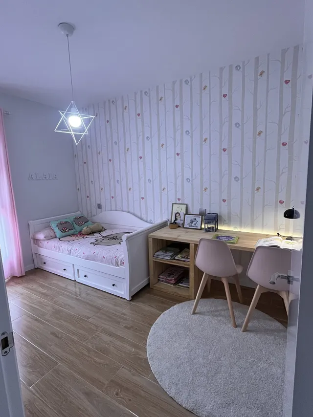 Lo pinté parcialmente a juego con la cama y añadí un toque de madera con vinilo adhesivo. Es un cambio sencillo pero que encaja perfectamente con el estilo natural de la habitación.