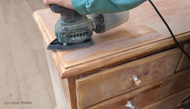 Primero pasé una lija de grano 40 para eliminar restos de barniz y nivelar la superficie. Después, una lija de grano 80 para dejarla suave.