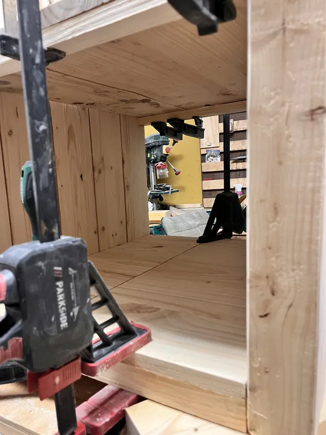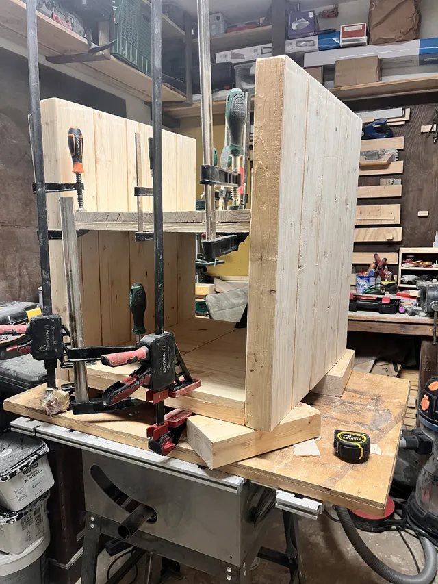 Montaje de la estructura tipo estantería Une los listones y tableros para formar la estructura. Distribución recomendada: Primera balda: a ras del tablero Segunda balda: a 28 cm de altura Esto genera espacios equilibrados y funcionales.