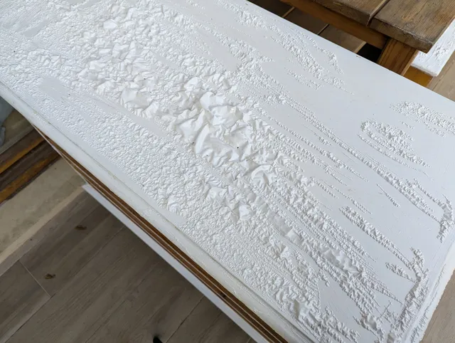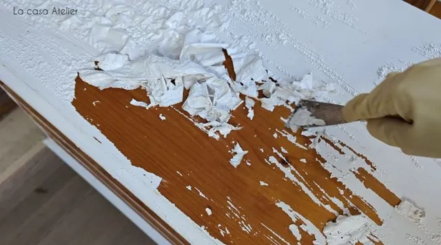 Cubrir bien la superficie con una capa generosa de decapante y dejar actuar el tiempo recomendado. En mi caso, la pintura empezó a levantarse enseguida.
