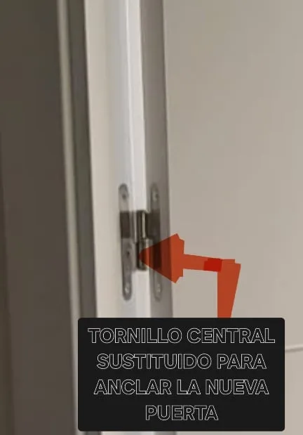 Y cuando hemos ajustado el marco nuevo con la hoja de la puerta puesta para poder ver que está bien cuadrada y ajustada en todos los lados, hemos quitado el tornillo central que va en la bisagra del marco y lo sustituimos por uno de 60 para anclar el marco de la nueva puerta al premarco.